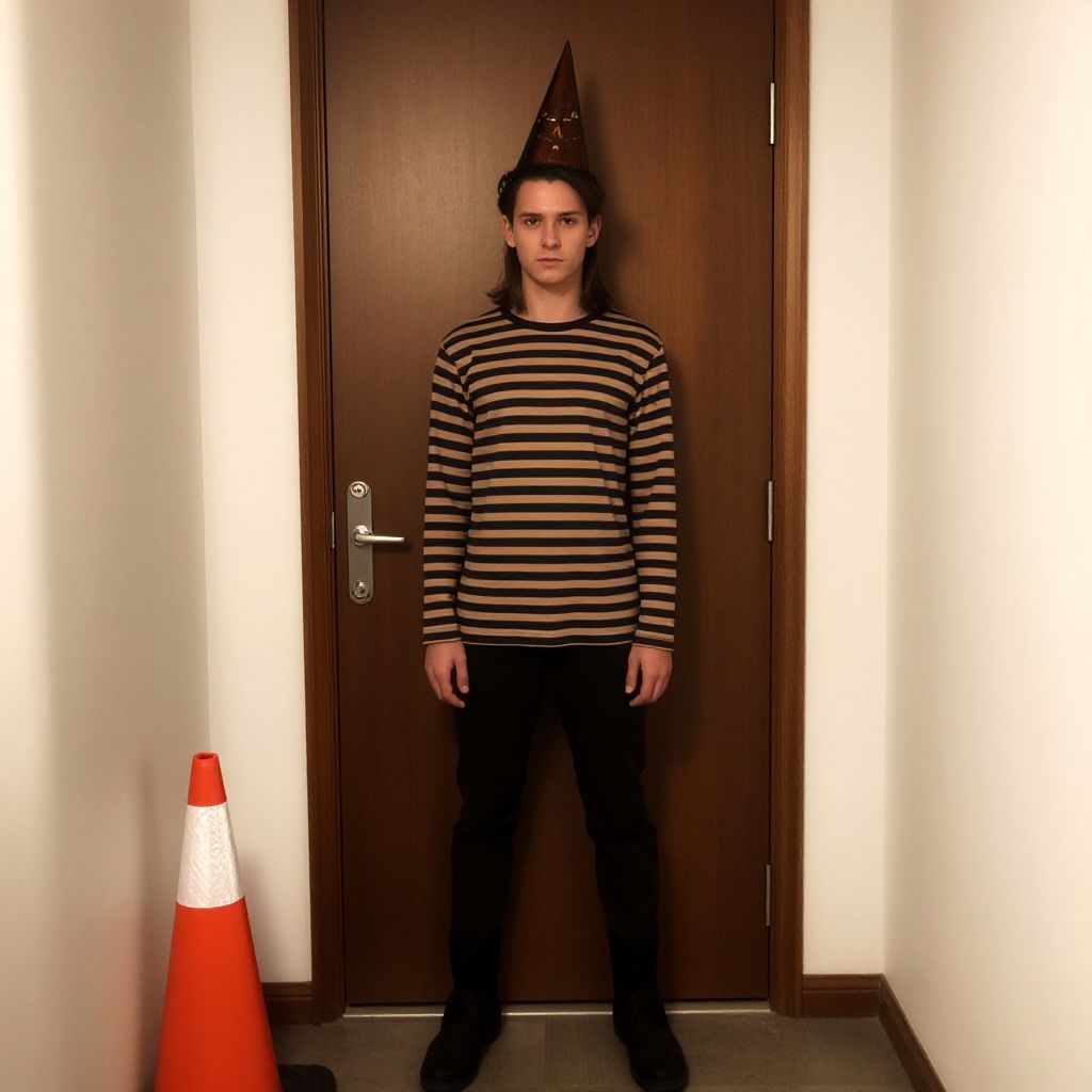 "halloween costume dark brown, party hat, solo, hat, male focus, standing, looking at viewer, pants, black footwear, 1boy, boots, full body, arms at sides, long sleeves, closed mouth, door, long hair, brown hair, striped clothes, shirt, traffic cone Realistic photo of casual sexy person with pretty face"
