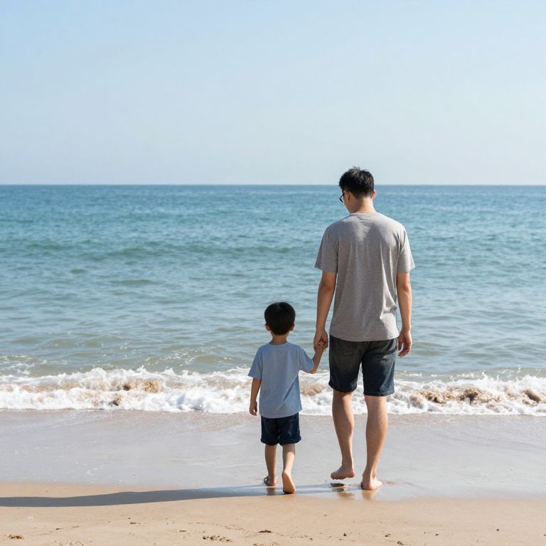 Hand in hand, father and son walk along the shoreline, their steps weaving a timeless thread of love and discovery as the ocean whispers stories of endless horizons and boundless possibility.