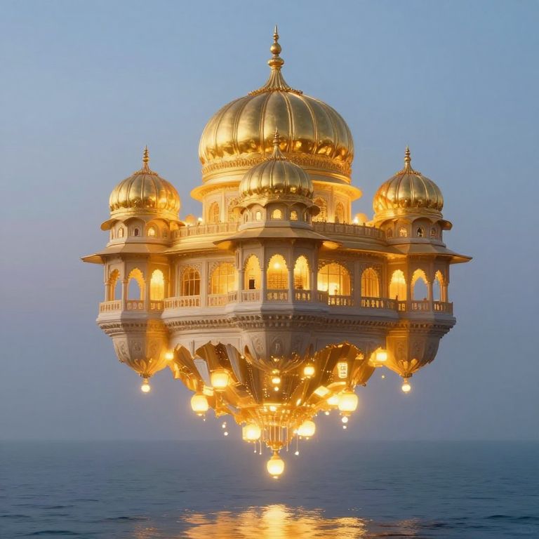 A luminous, floating citadel of golden domes and cascading lanterns hovers serenely above a tranquil sea, defying gravity with its ethereal glow and impossible grandeur.
