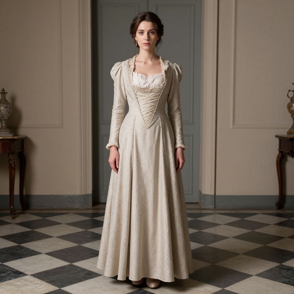 Photograph of a young woman with fair skin and dark brown hair in an elegant, vintage-style, cream-colored gown with puffed sleeves and a fitted bodice. The gown features intricate lace detailing and a square neckline. She stands in a grand, classical room with pale beige walls and a black-and-white checkered floor. Behind her is a closed blue door. Two wooden side tables with ornate vases flank the background. The lighting is soft, highlighting the gown's textures and the room's refined decor. The woman's expression is neutral, and she gazes directly at the camera.