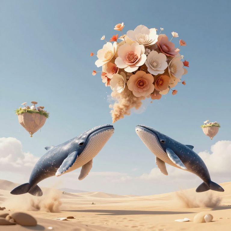 Dog-sized whales leap gracefully between floating islands in a sky desert, exhaling clouds of sand that bloom into paper flowers when touched.