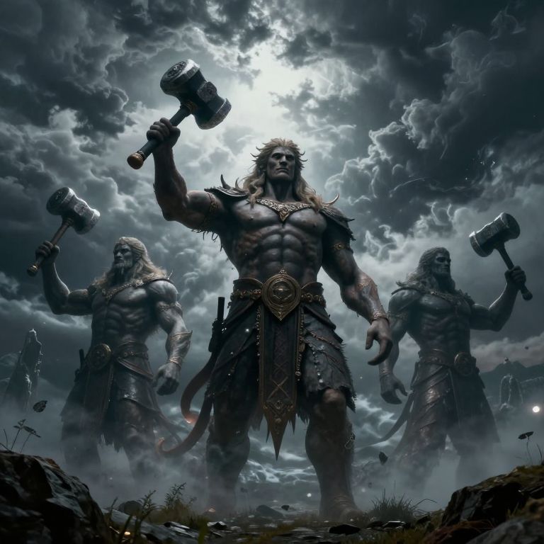 In a realm where myth and reality intertwine, giants stand at the threshold of earth and sky, wielding enchanted hammers to shape the heavens into storms that dance between blessing and curse, their presence evoking a profound sense of awe and existential mystery.