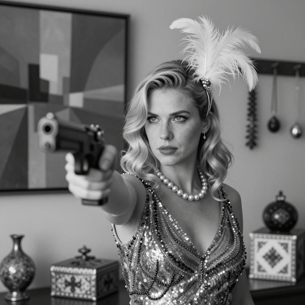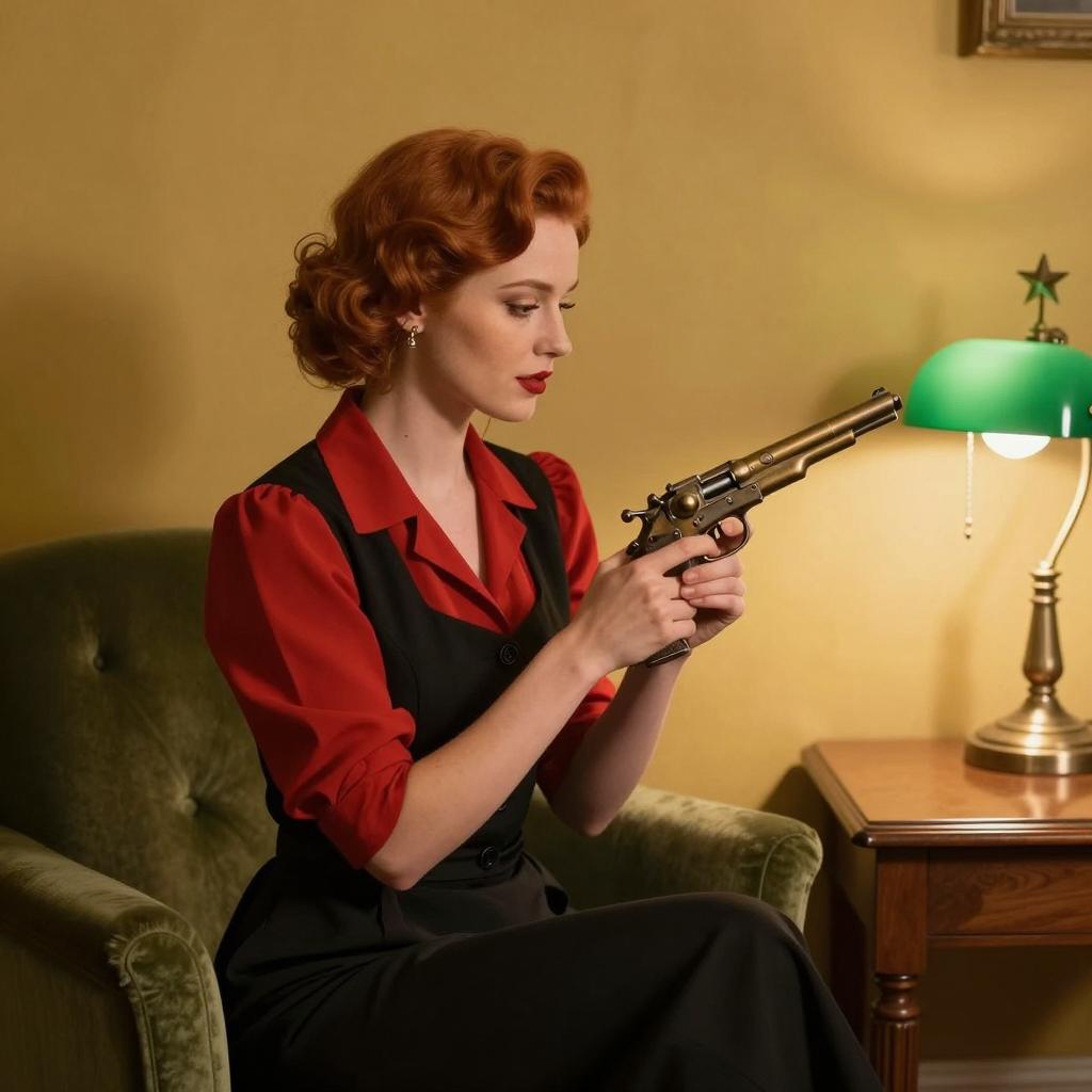 Woman with red hair in a vintage updo, wearing a black dress with a red blouse, sits in a green armchair. She holds a bronze gun, looking down at it. Yellow wall background. Green lamp with star-shaped top on table to her right. Table is wooden with a flat surface. Warm, soft lighting from lamp.