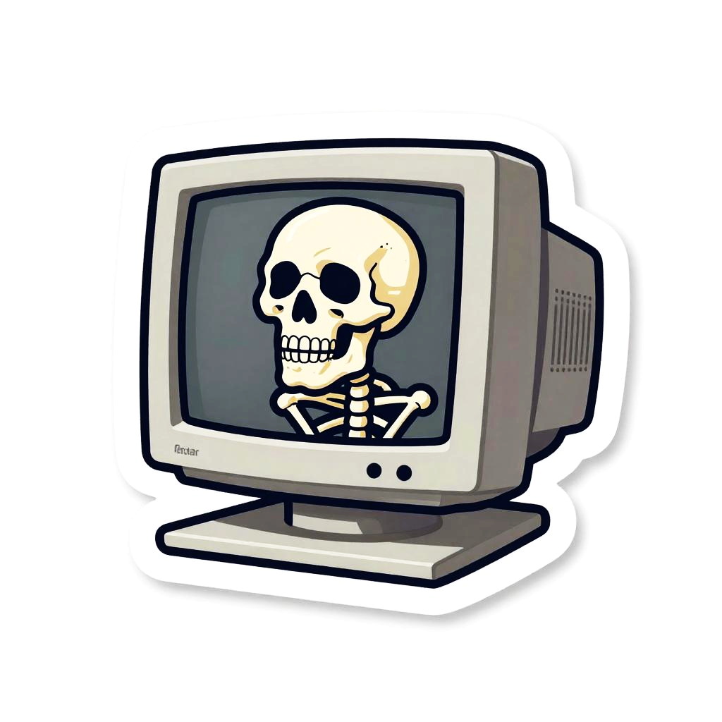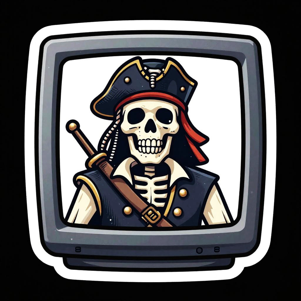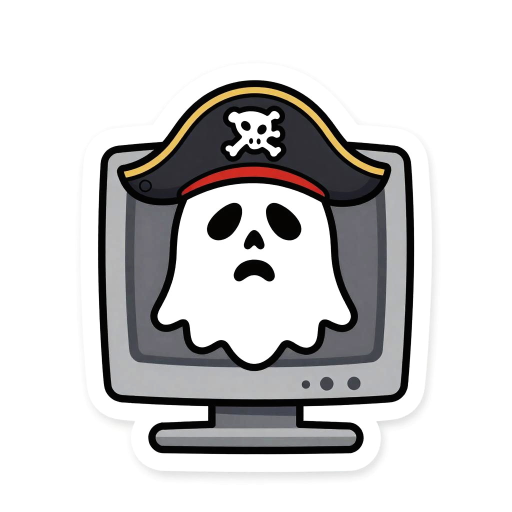 Sticker of a corsair ghost using a classic CRT monitor, digital painting, ultra realistic, black background