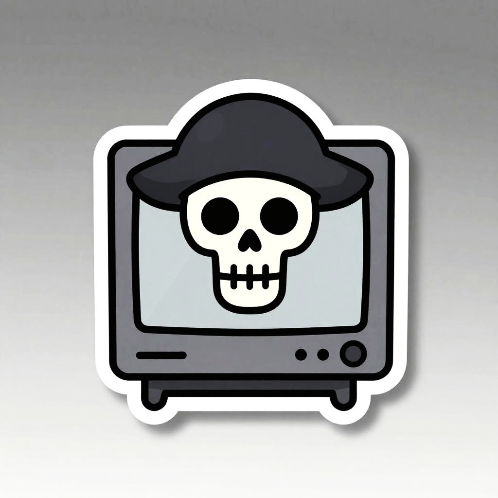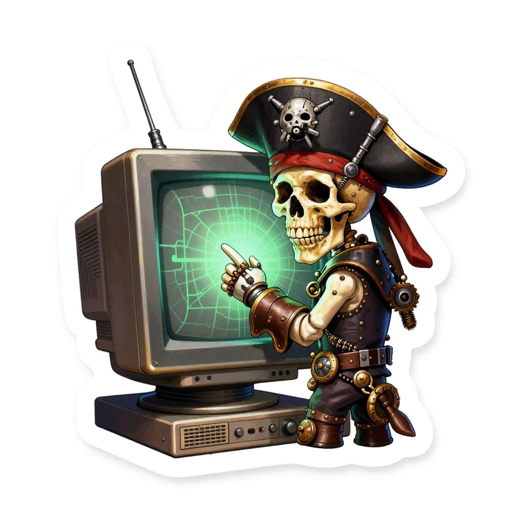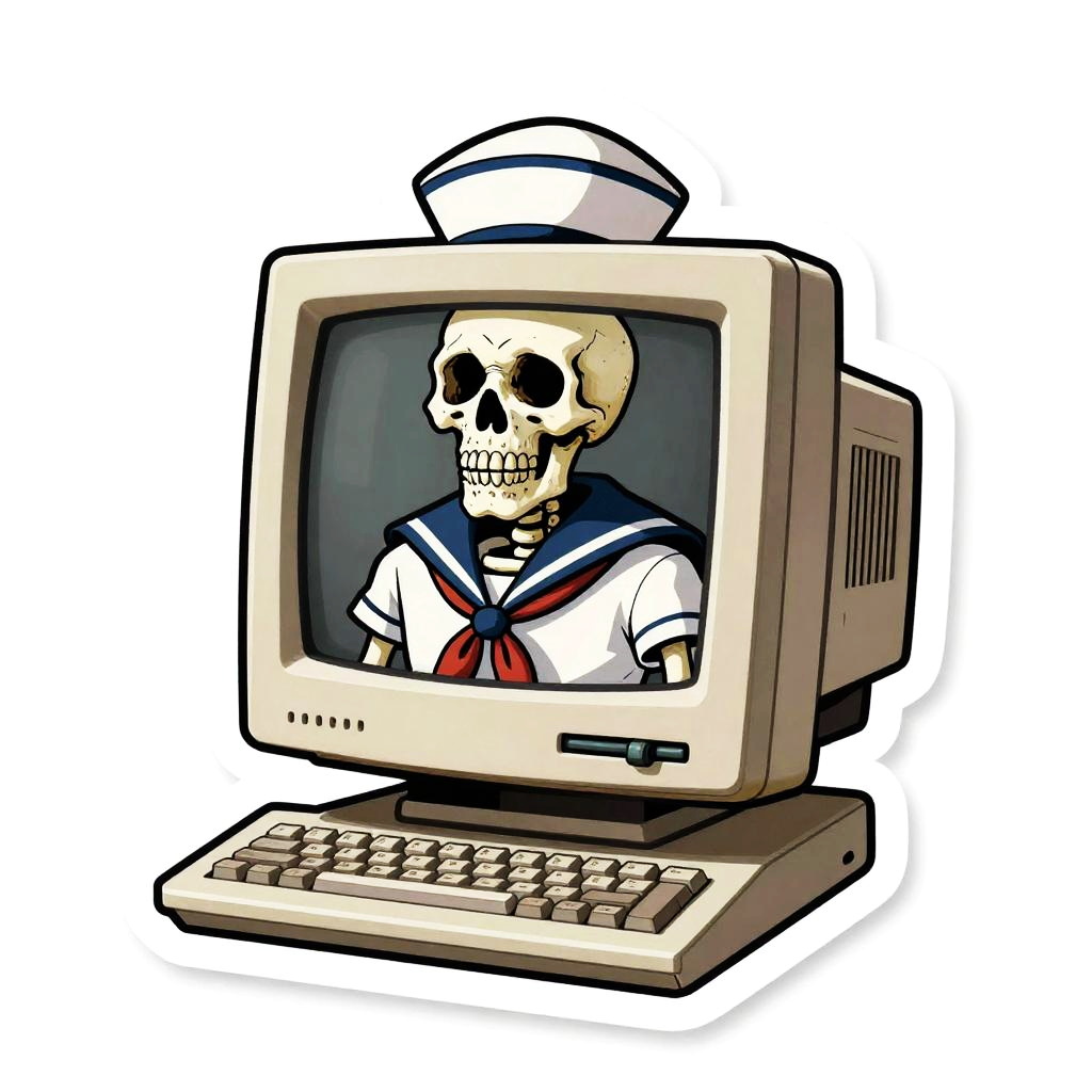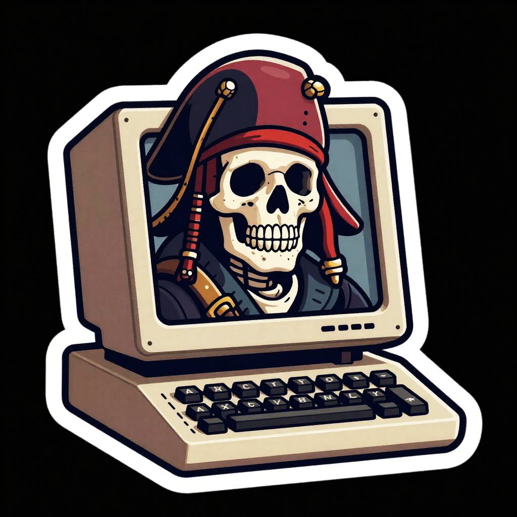 Sticker of a corsair ghost using a classic CRT monitor, digital painting, ultra realistic, black background