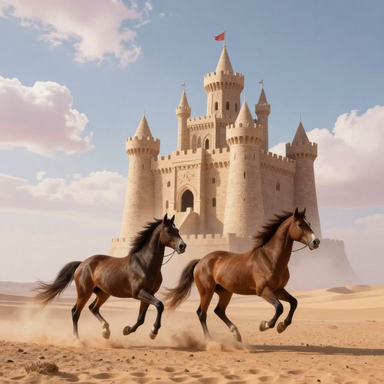 Two majestic steeds gallop across a desolate desert landscape, each bearing the weight of an impossibly grand castle, defying gravity as they traverse the endless expanse beneath a dreamy, cloud-dappled sky.