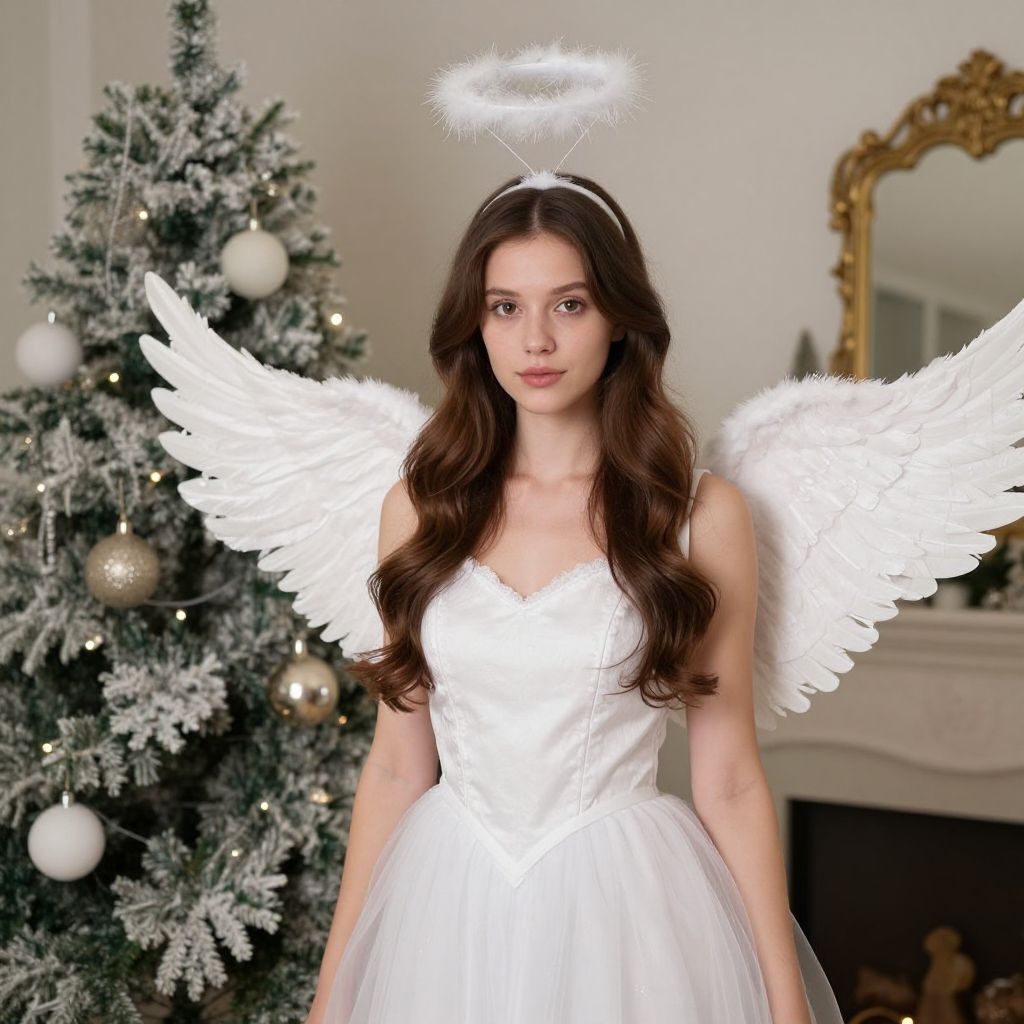 Angel costume christmas play, 1girl, halo, angel, solo, wings, angel wings, brown hair, long hair, dress, christmas tree, white dress, realistic, looking at viewer