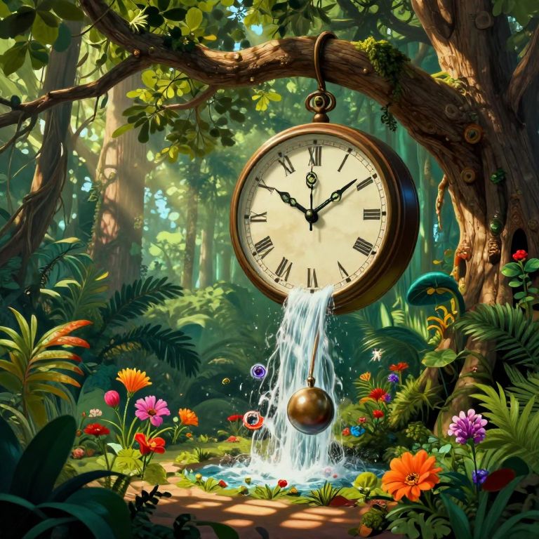 Imagine a surreal digital artwork set within an exotic jungle, reminiscent of Salvador Dali's dreamscapes but with a unique twist. Picture a close-up view of a massive timepiece suspended from the bough of a majestic tree, its mechanism dissolving into the lush vegetation below. The pendulum swings gracefully through a waterfall of colorful blooms and verdant leaves, creating an ethereal contrast between the angular clock and the organic shapes around it. This captivating scene captures both tranquility and intrigue, as dappled sunlight filters through the dense foliage, casting intricate shadows across the jungle floor that dance with the soft light, evoking a sense of timelessness and the passage of hours in both literal and metaphorical ways. The vivid color palette enhances this dreamlike atmosphere, blending harmoniously to create an enchanting visual experience.