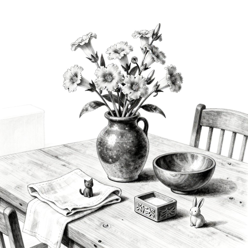 Black-and-white, whimsical hand-drawn still life on a rustic dining table corner, centered on hand-thrown clay jar with garden snapdragons. Arranged around it: linen napkins, wooden fruit bowl, carved salt box. Tiny figurines of a cat and a rabbit add charm. Background is minimal, a few lines suggesting a wall and horizon. Soft shading, gentle crosshatching, delicate line art, balanced negative space, subtle paper grain, calm studio light, sketchbook aesthetic.