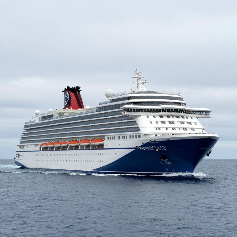 A large cruise ship, the Norwegian Encore, sails through a cloudy sky, navigating the open sea.