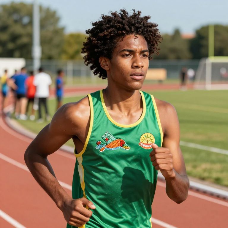 A diverse young athlete with dark curly hair and warm brown skin, wearing an eco-friendly, embroidered athletic singlet, training on a sunlit outdoor track during a summer morning, with spectators in the background, vibrant colors, photorealistic style.