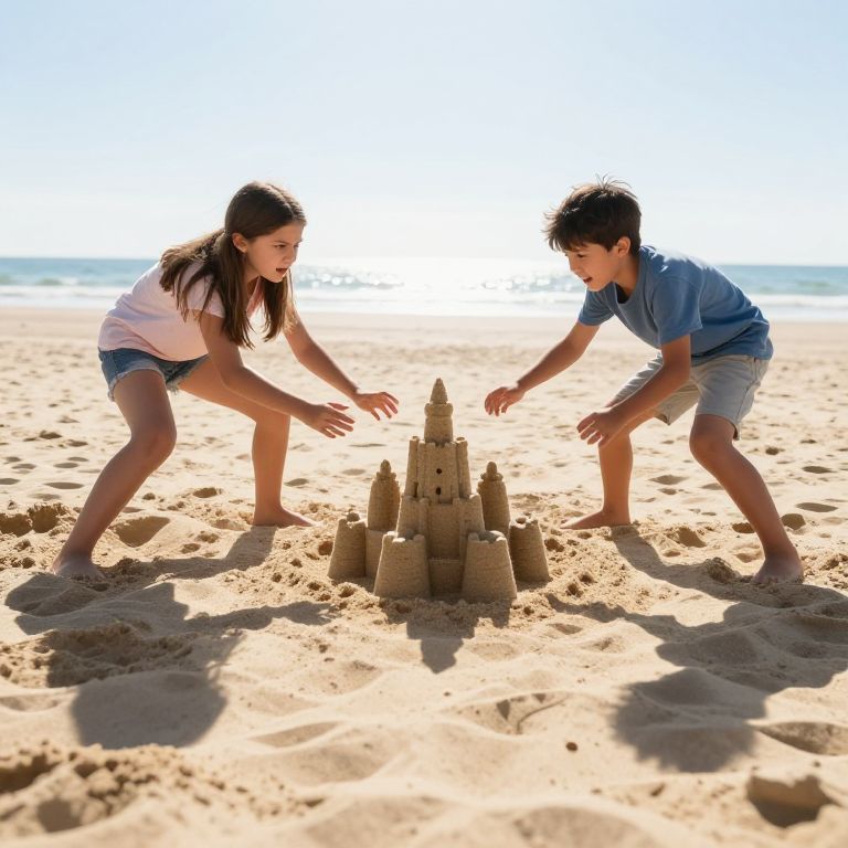 Shadow Puppetry angry 13 year old girl and 13 year old boy fighting on the beach over a sandcastle wide angle, zoomed out, sunny day. 25mm lens,