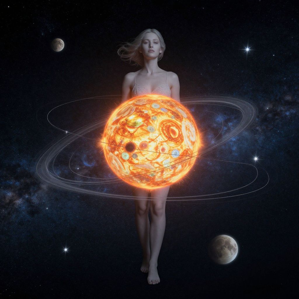 Digital artwork of a blonde woman floating in space, holding a glowing, fiery sun with rings, surrounded by stars and planets.