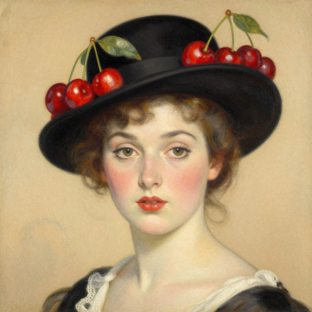 Photograph-style digital painting of a fair-skinned woman with green eyes, wearing a black hat adorned with red cherries, lace-trimmed black