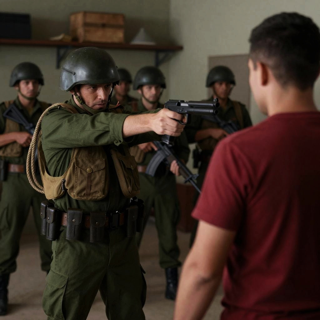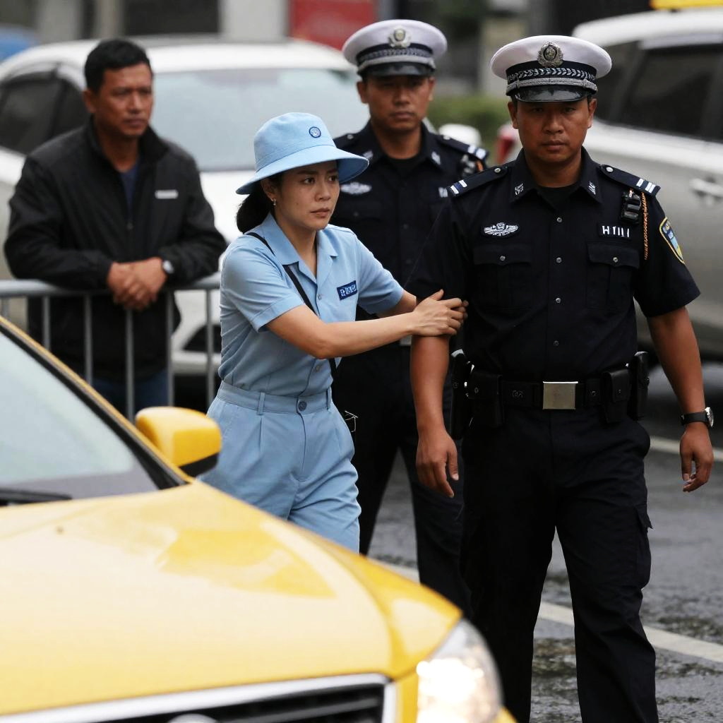 Photograph of three people in white hazmat suits restraining a woman with dark curly hair and a blue top on a sidewalk. She is struggling, arms raised, near a dark green van. Two hazmat-suited individuals hold her arms, one holds a can. Sunlight highlights the scene, and a bush is in the background. Intense expressions on the woman's face.