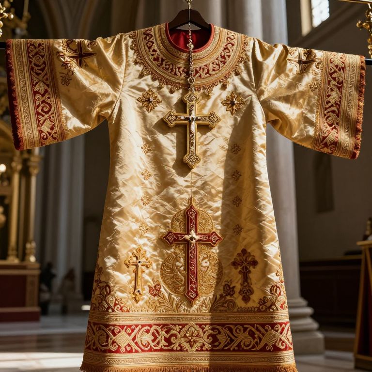 Analavos, a richly embroidered traditional Eastern Orthodox vestment, displayed in a sunlit ancient cathedral, intricate gold and red patterns, hanging solemnly with heavy ornate crosses, soft dramatic lighting, high detail, sacred atmosphere