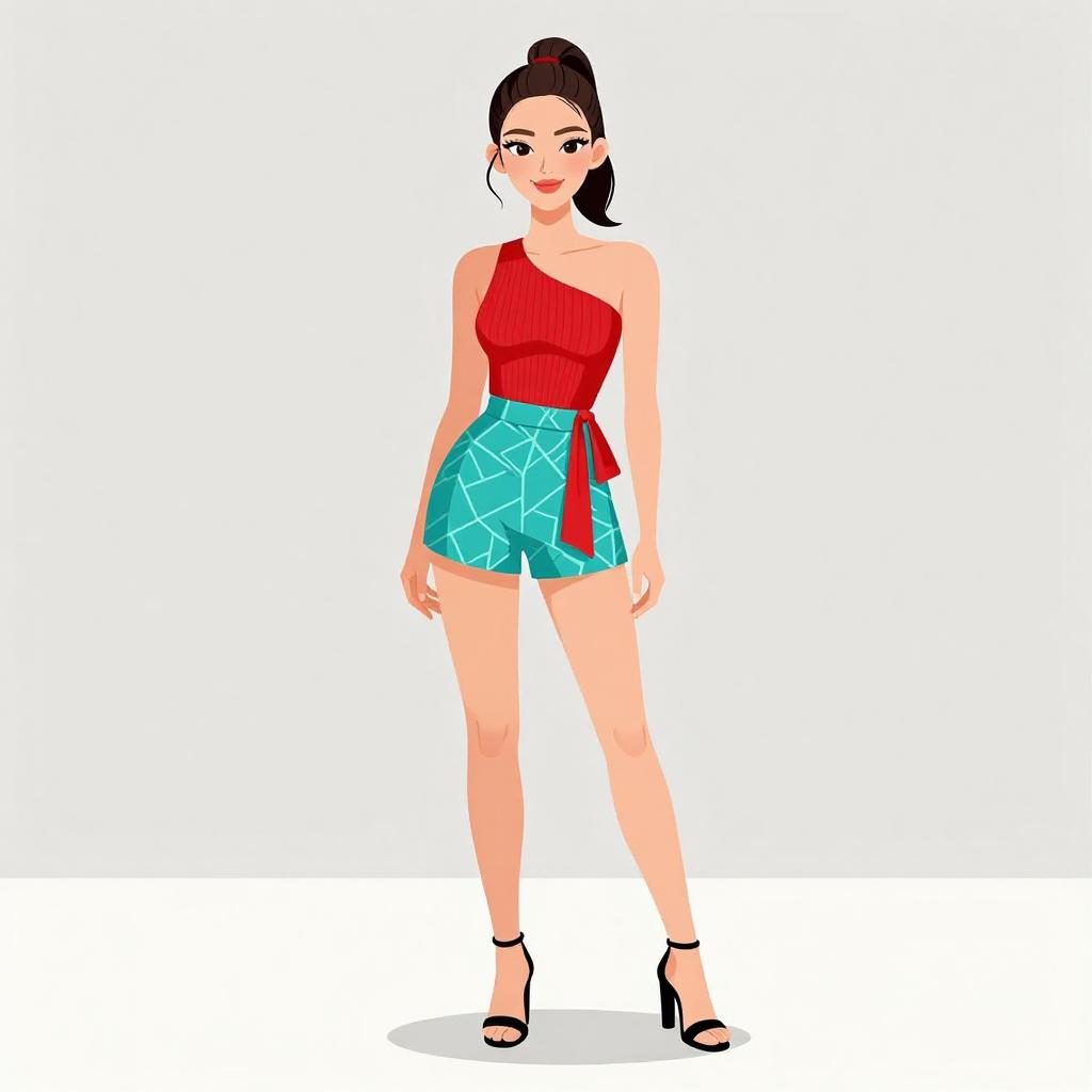 This is a digital illustration of a young woman with light skin and dark brown hair in a high ponytail. She wears a red, one-shoulder top, and high-waisted, turquoise shorts with a white geometric pattern. A red bow is tied at the waist. She stands confidently with a slight smile, her arms relaxed by her sides. She is wearing black high-heeled sandals. The background is plain white, making her outfit and pose the focal points. Her makeup includes dark eyeliner and red lipstick, complementing her stylish attire.