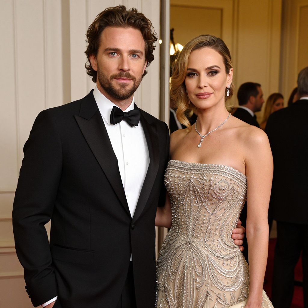 Photograph of a couple at a formal event. The man, with curly brown hair and a trimmed beard, wears a black tuxedo with a white shirt and black bow tie. The woman, with blonde, shoulder-length hair, wears a strapless, glittering, silver gown with intricate beadwork. She accessorizes with a silver necklace and earrings. They stand close together, with the man's arm around the woman's waist. The background features a softly lit, elegant interior with white paneled walls and a blurred crowd in formal attire. The overall color palette includes blacks, whites, silvers, and warm background tones.