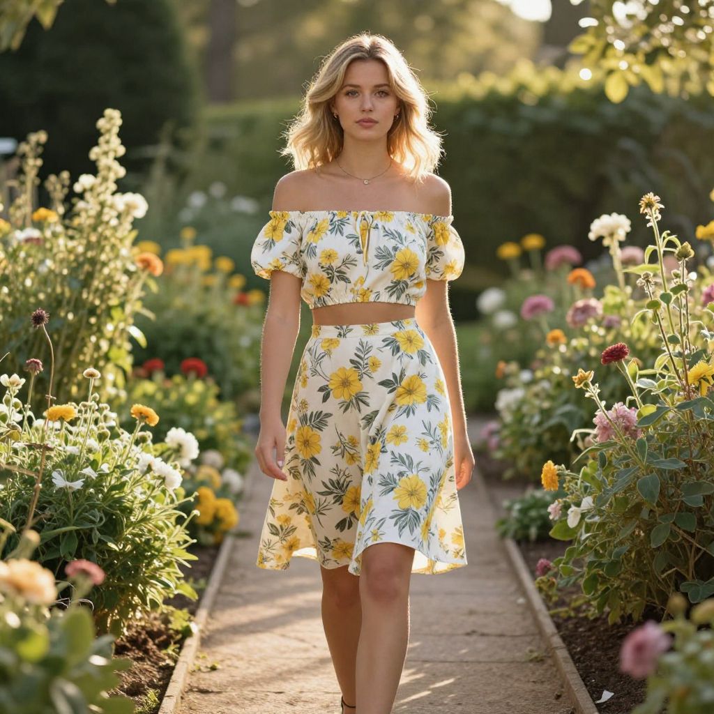 Isla Fisher body in a casual summer dress, walking through a blooming garden, soft pastel color palette, natural light, impressionist art style, whimsical atmosphere