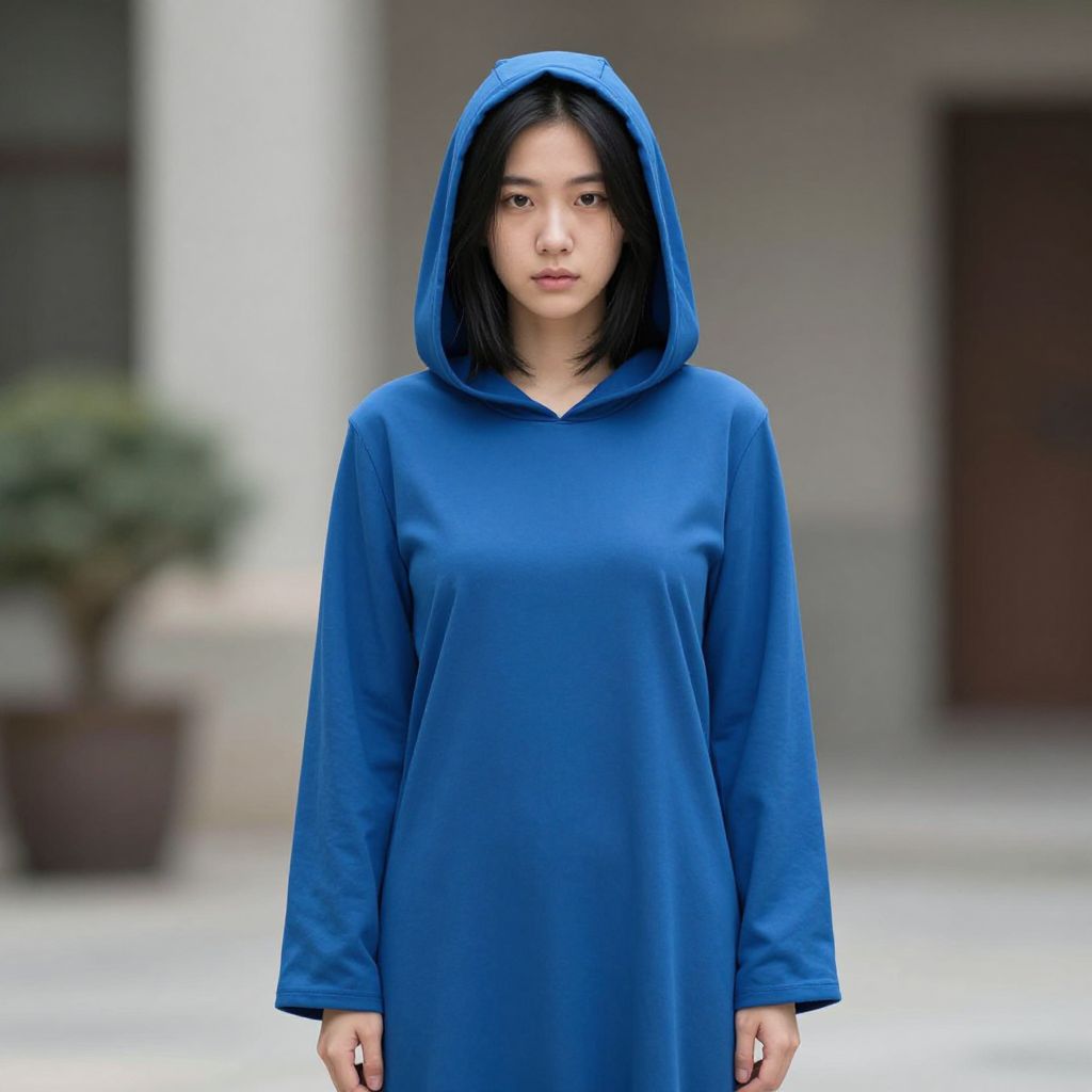 Photograph of an Asian woman with straight black hair, wearing a loose-fitting, long-sleeved, bright blue hooded dress that reaches mid-thigh. She has a neutral expression, light skin, and is standing in a slightly blurred urban background with a potted plant on the left and a gray building on the right. The hood of her dress is pulled up, covering her hair. The image has a soft focus effect, emphasizing the subject while blurring the background. The overall tone is calm and subdued.