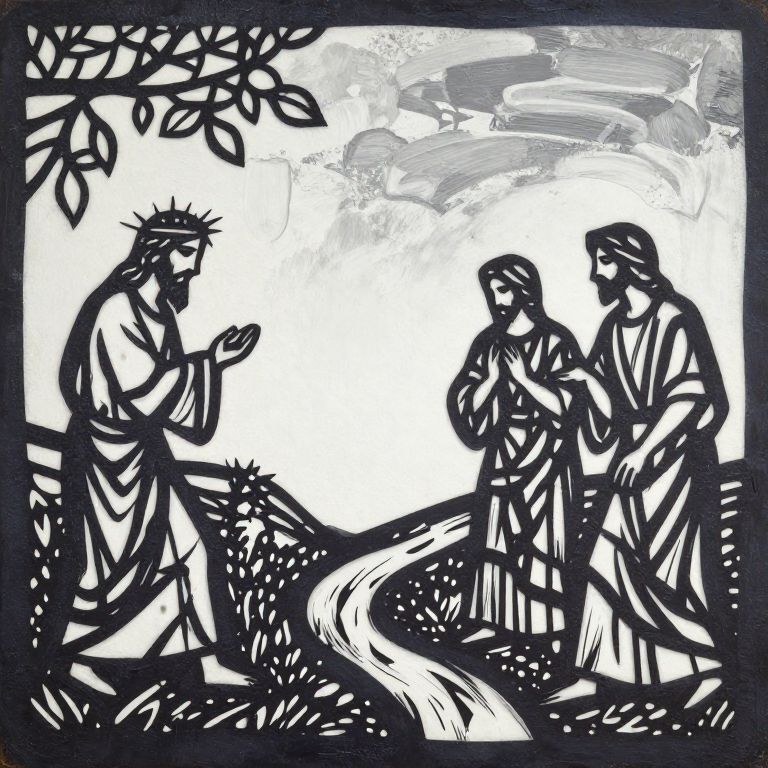 This black-and-white woodcut-style drawing depicts a biblical scene with three figures. On the left, a crowned male figure with a thorny crown, wearing a long robe, gestures with his hands. Two other robed figures stand to the right, one with a hand on their chest, appearing pensive. The background features a winding path with leafy branches overhead and a cloudy sky. The composition uses bold, high-contrast lines and shapes, emphasizing the dramatic, symbolic nature of the scene. The style is reminiscent of traditional woodcuts with a focus on strong, graphic elements and minimalistic detail.