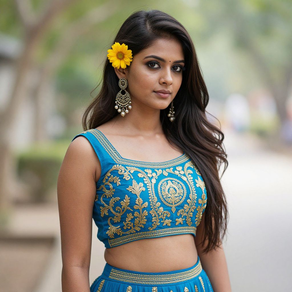 A bold, confident woman with short hair and a strong jawline in a blue floral-patterned blouse and a sequined lehenga, walking through a bustling market in a modern Indian city with vibrant stalls, colorful fabrics, and people in traditional wear in the background, natural daylight, realistic portrait style.. The woman has big breasts and cute face