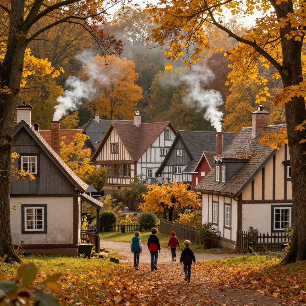A quaint autumn village with timber-framed houses and smoke rising from chimneys, surrounded by trees in full fall colors, children playing among fallen leaves, golden hour lighting, nostalgic and heartwarming mood, painterly style.
