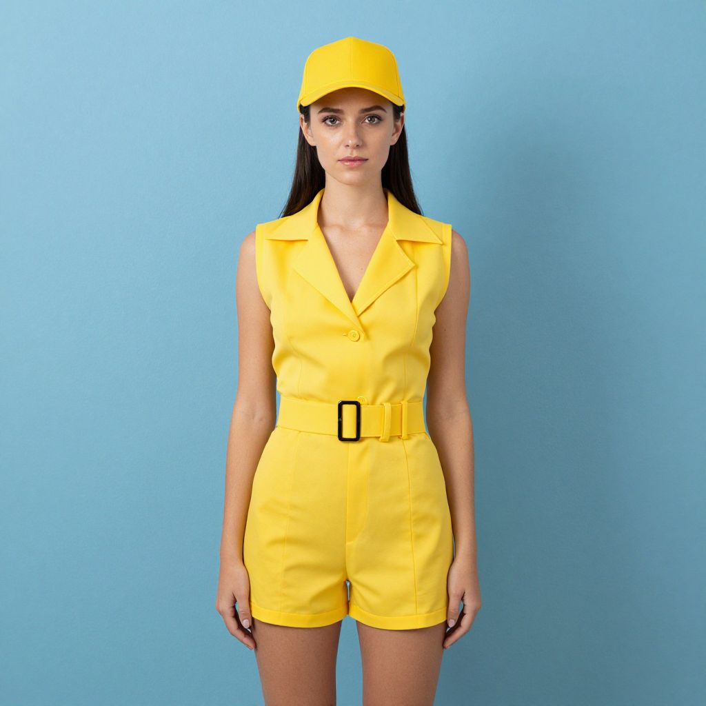 Sleeveless Cop Costume, woman in a yellow vest and hat standing in front of a blue wall