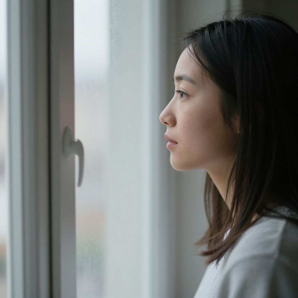 Photograph of an East Asian woman with straight, dark brown hair, gazing out a window to the left. She has a fair complexion and is wearing a white top. Her expression is contemplative, with slightly parted lips and downcast eyes. The window frame is white, and the blurred background outside the window is bright with soft white and gray tones, suggesting daylight. The image focuses on her profile, highlighting her delicate features and serene demeanor. The lighting is natural, casting soft shadows and highlighting her face gently.