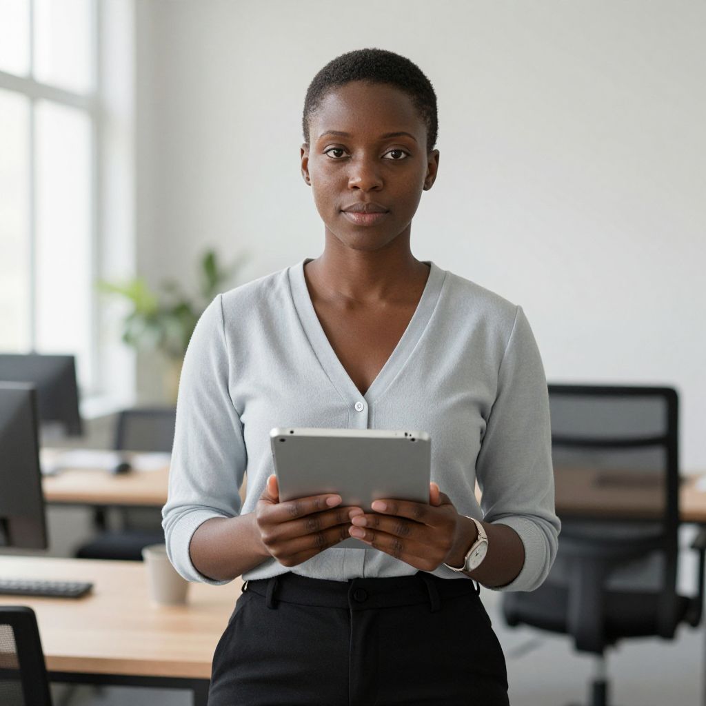 Photograph of a serious, dark-skinned woman with short hair, wearing a white blouse and black pants, holding a tablet in a bright, modern
