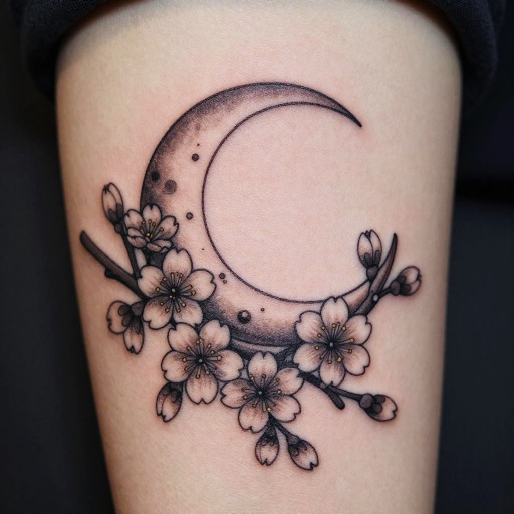 Moon scene tattoo featuring a crescent moon nestled within blooming cherry blossoms, fine line details and soft shading, evoking a serene night atmosphere.
