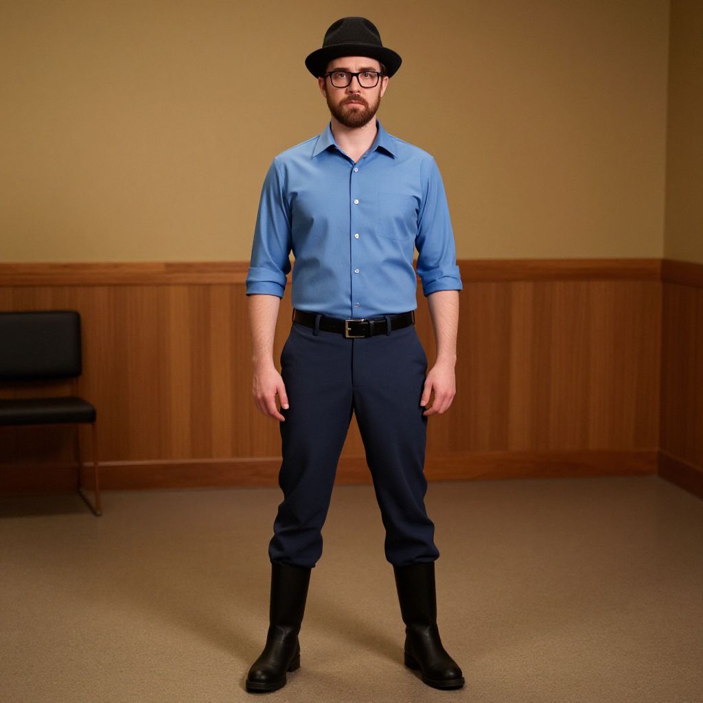 Mythbusters costume, 1boy, male focus, solo, hat, shirt, pants, boots, glasses, belt, standing, facial hair, full body, indoors, collared shirt, blue shirt, black footwear, beard