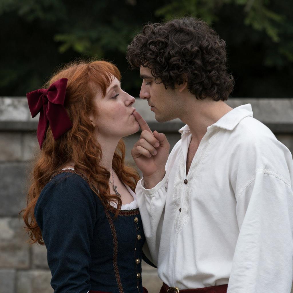 Black-and-white photograph of two people in historical attire. The person on the left, with curly hair and a fringed tunic, reaches towards the person on the right, who is leaning forward. Both are outdoors, with trees in the background. The right person's face is partially shadowed.