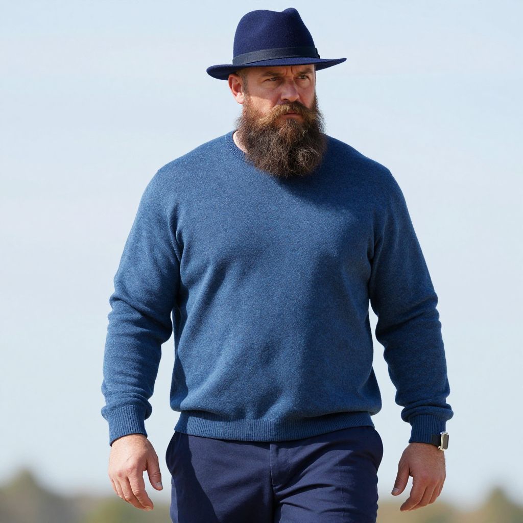 A man with a long beard and a blue hat is wearing a blue sweater and blue pants. He is tall and muscular, with a strong, rugged appearance. His beard is neatly trimmed and gives him a dignified look. The blue hat is well-fitted, and the blue sweater is slightly oversized, adding a casual yet stylish touch to his outfit. The blue pants are clean and well-fitted, emphasizing his athletic build. The scene is set in a peaceful outdoor environment, with a clear sky and gentle breeze, highlighting his calm and grounded presence.