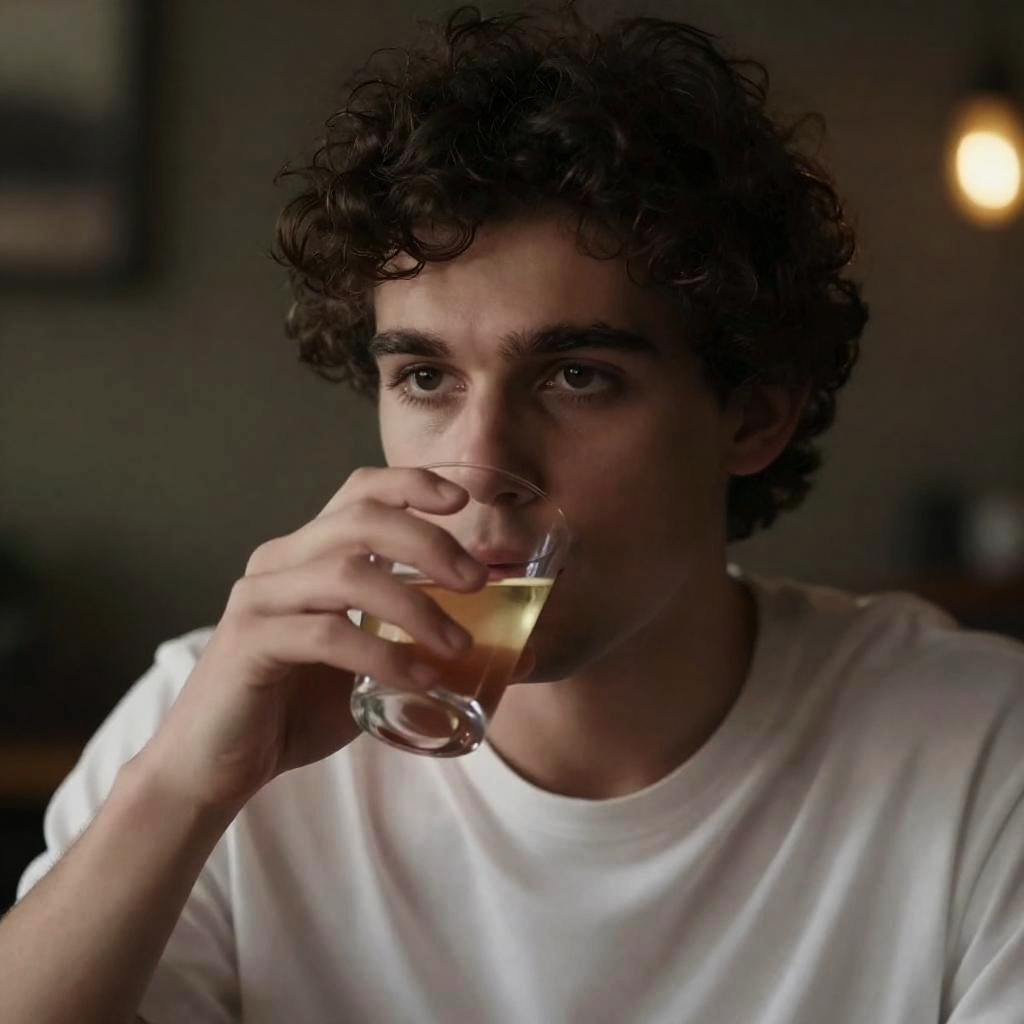 Photograph of a young man with fair skin, dark brown hair, and blue eyes, wearing a light blue tank top and a black necklace with a pendant. He is sitting at a wooden table with a glass dish in front of him. His expression is surprised and slightly concerned. The background is a dimly lit room with a wooden cabinet on the left.