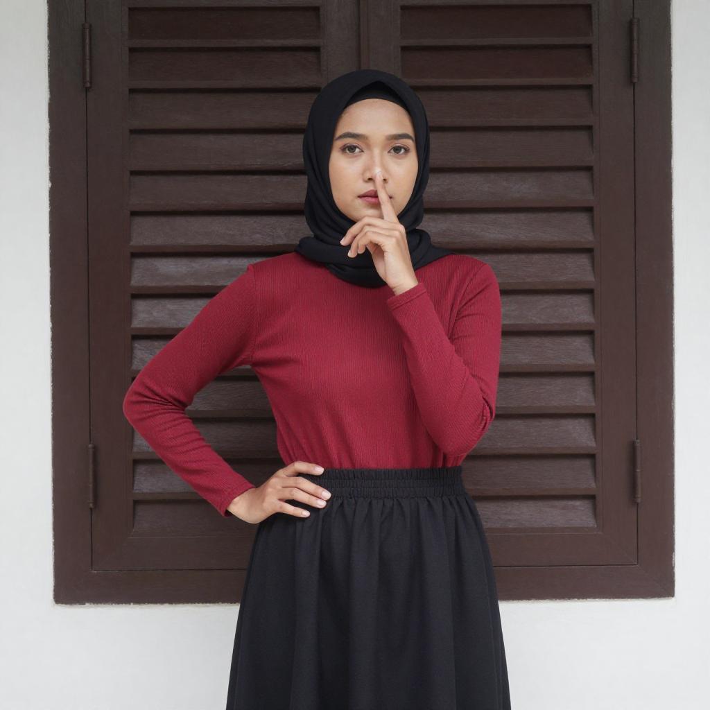 Photograph of an Asian woman with fair skin, wearing a black hijab and a red ribbed long-sleeve top, paired with a black skirt. She stands with one hand on her hip and the other finger to her lips, looking at the camera. A dark wooden window with horizontal slats is in the background.