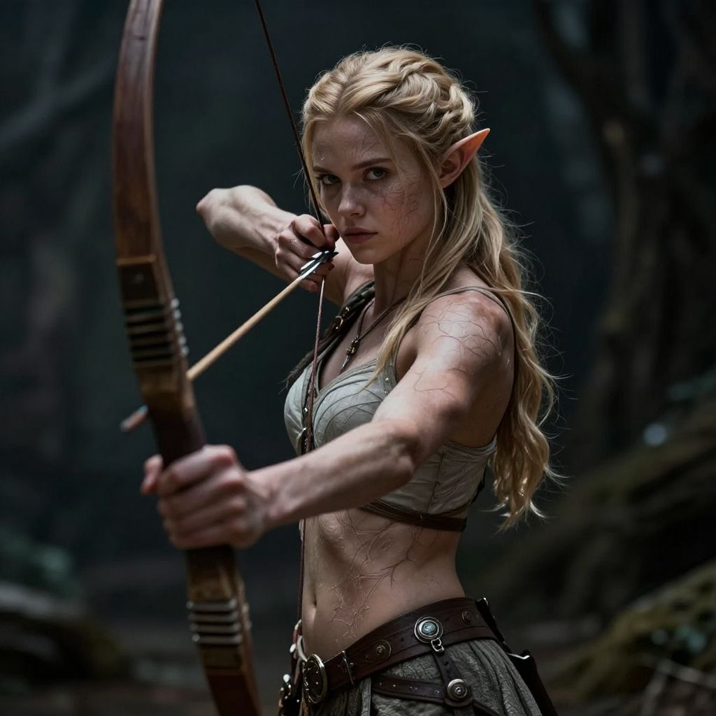 Photorealistic digital artwork of a blonde, elven woman with pointed ears, drawing a wooden bow in a dark, forested background. She has long, wavy hair and is wearing a gray, sleeveless crop top that reveals her toned, muscular arms and midriff. Her skin is fair with a few visible bruises. She has a focused, determined expression. She wears a dark, pleated skirt with a leather belt and a necklace. The bow is intricately designed with natural wood textures. The background is blurred, emphasizing the subject and creating a sense of depth. The image has a dramatic, high-contrast style.
