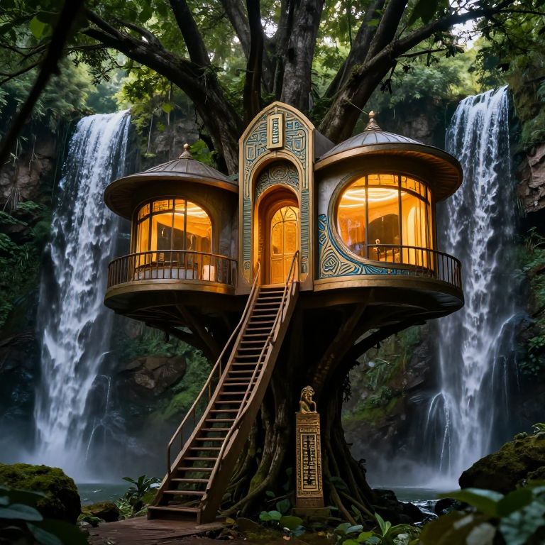 The image showcases an ultra-modern, futuristic treehouse nestled between two majestic waterfalls in a dense forest. The treehouse, with its art nouveau shapes and Arabic ornaments, features a unique design with large, curved windows that emit a warm, golden glow. The structure is elevated on stilts, with a central staircase leading up to the entrance. The treehouse is adorned with ancient Egyptian pylons and steles, adding a touch of historical grandeur. The scene is illuminated by cinematic lightning, creating a dramatic and otherworldly atmosphere. The surrounding forest is lush and verdant, with trees and foliage extending from the treehouse, blending the man-made structure with nature. The overall composition is harmonious, with the treehouse and waterfalls creating a balanced and visually striking scene.