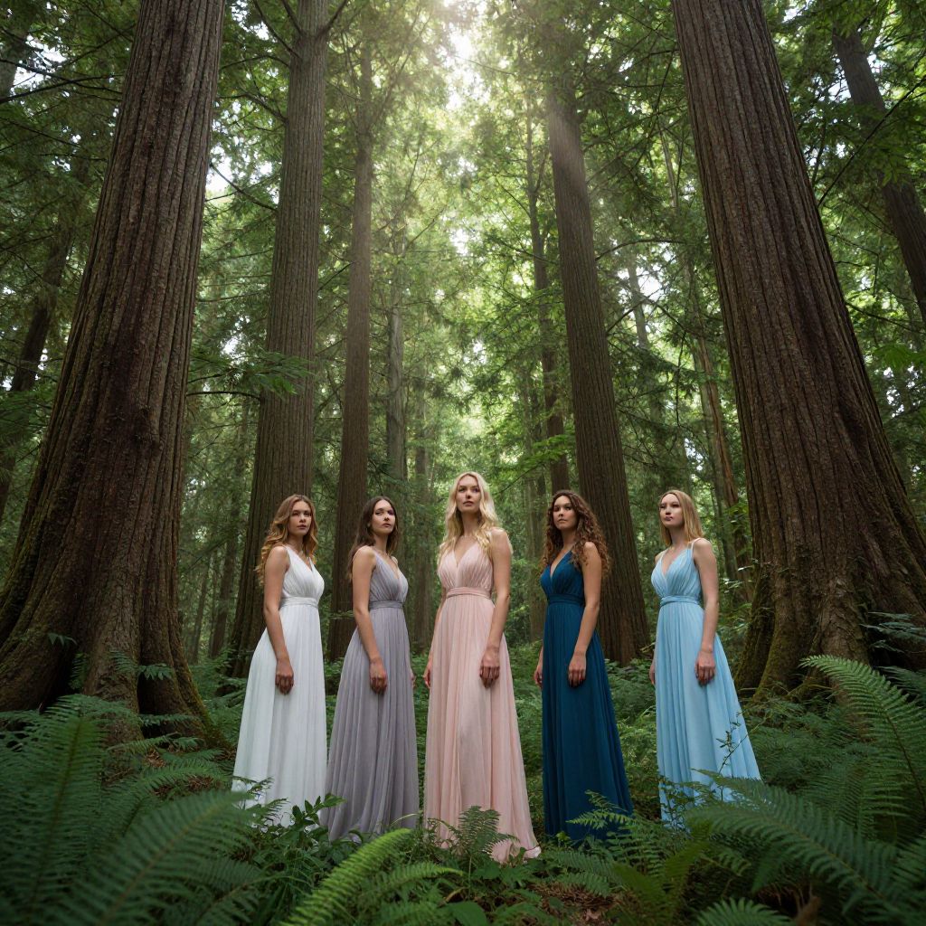 Photograph of five women in flowing, pastel dresses standing in a sunlit redwood forest, surrounded by tall trees and lush greenery.