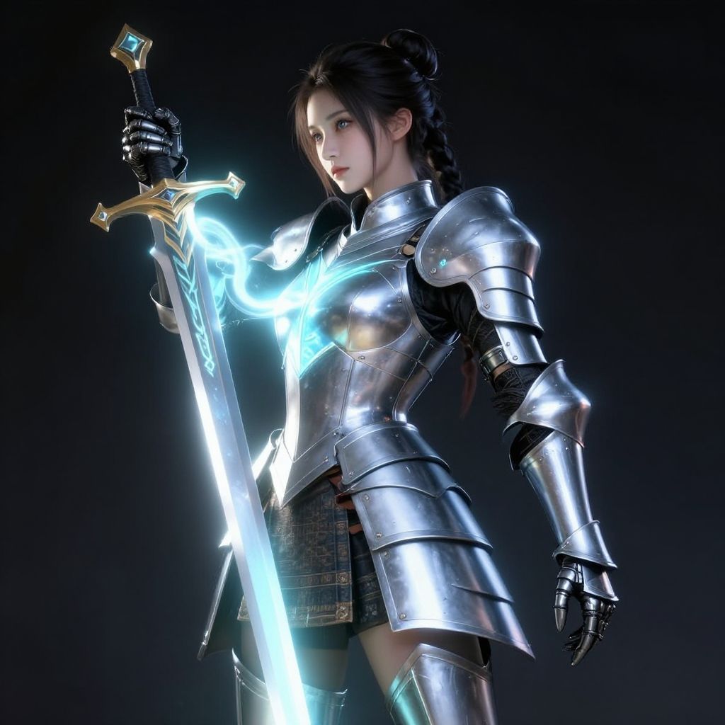 Digital CGI of an attractive Asian woman in shiny silver armor, holding a glowing blue sword, with a braid and intense gaze.
