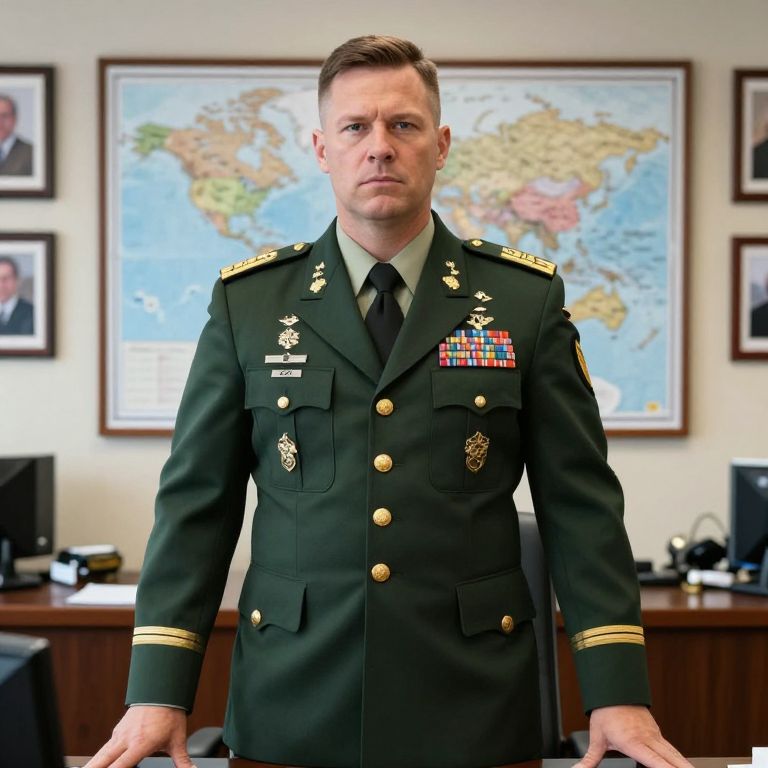 Photograph of a serious-looking, fair-skinned man with short, light brown hair, standing in an office. He is wearing a dark green military uniform with gold buttons, various colorful ribbons, and a black tie. The uniform has gold stripes on the sleeves and shoulder epaulettes. Behind him is a large, colorful world map on the wall, framed pictures on either side, and a wooden desk with a computer monitor and other office items. The lighting is bright, highlighting his focused expression and formal attire. The image has a clear, professional quality.