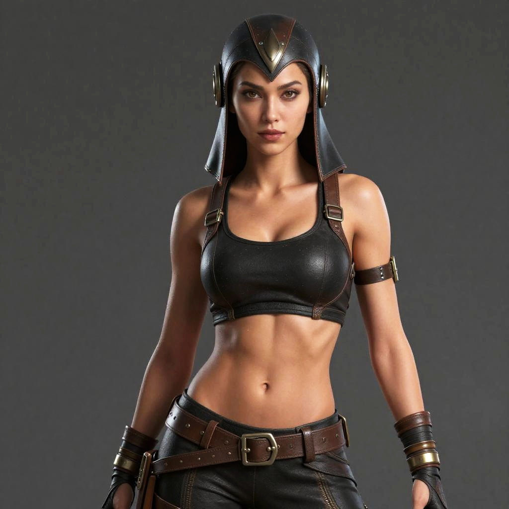 Photorealistic CGI of a bruised, dirty, dark-haired woman in a torn beige tank top and military pants, standing in a fiery, ruined
