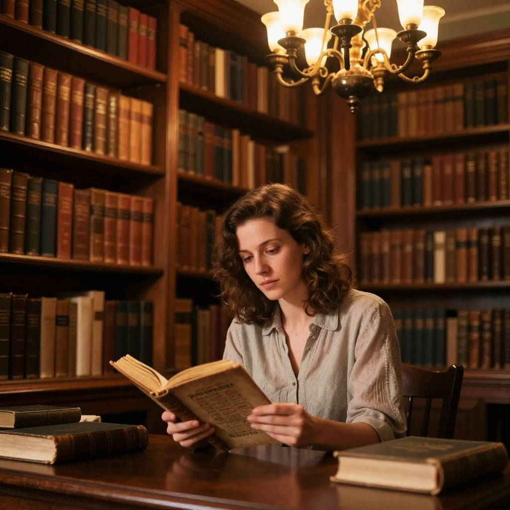 Maud in a cozy vintage library, surrounded by towering oak bookshelves filled with leather-bound books, warm golden lighting from an ornate chandelier, her thoughtful expression as she reads an ancient manuscript, classical realism