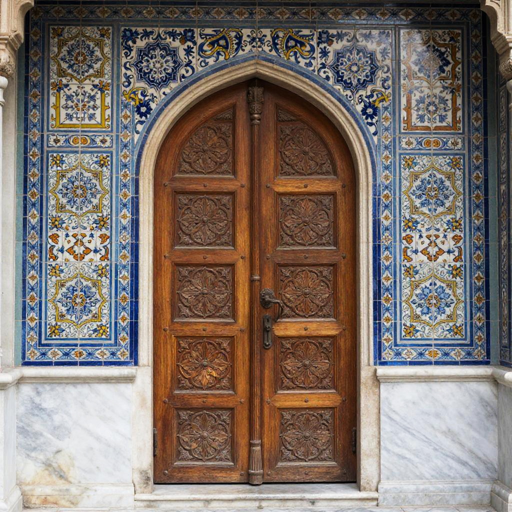 This is a photograph of an intricately designed, ornate wooden door set within a decorative, arched stone frame. The arch is covered in detailed, colorful tile work with geometric and floral patterns. The door has six ornate panels with carved floral designs. The bottom of the frame is adorned with white marble accents. The overall style is traditional and elaborate.