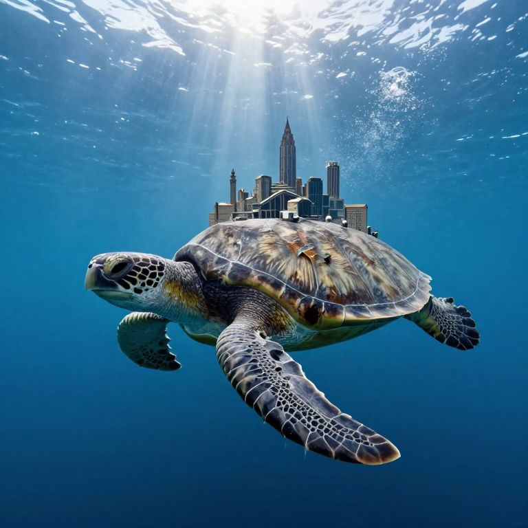 This vibrant digital artwork depicts a large sea turtle swimming towards a miniature cityscape of skyscrapers and buildings, set against a clear, sunlit blue ocean. The turtle's detailed, textured shell and flippers contrast with the smooth, reflective water. Sunlight beams penetrate the water from above, illuminating the scene and creating a shimmering effect. The cityscape, positioned centrally and slightly above the turtle, resembles a tall, slender skyscraper surrounded by shorter buildings, all rendered in shades of grey and blue. The overall composition blends realism with surrealism, emphasizing the turtle's graceful movement and the juxtaposition of marine life with urban architecture.