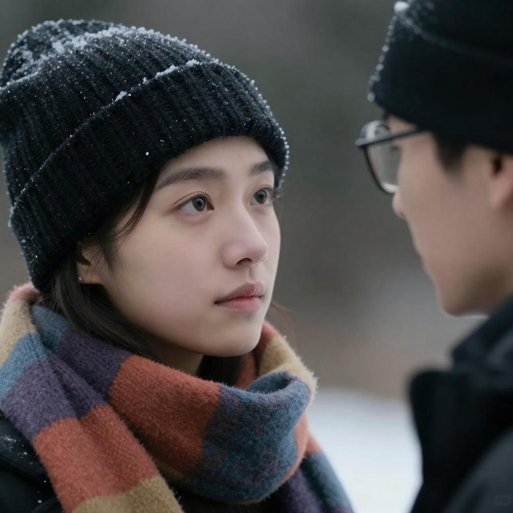 Portrait of a young East Asian woman standing outdoors in a snowy winter setting. She wears a stylish blue double-breasted coat and a grey patterned scarf, with softly falling snowflakes visible around her. The background shows blurred trees blanketed in snow, creating a serene and tranquil winter atmosphere.