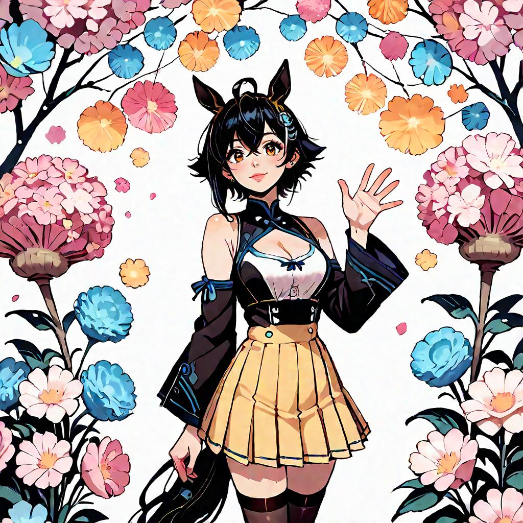 This is a digital anime-style illustration of a young woman with short, black hair adorned with a black bow. She has large, expressive brown eyes and a light skin tone. She is wearing a black, sleeveless top with a high collar, and a yellow, pleated mini skirt. Black, thigh-high stockings complete her outfit. She is waving with her right hand. The background is filled with vibrant, colorful flowers in shades of pink, orange, blue, and white, surrounded by dark green leaves. The overall style is bright and cheerful, with a focus on the character in the center.
