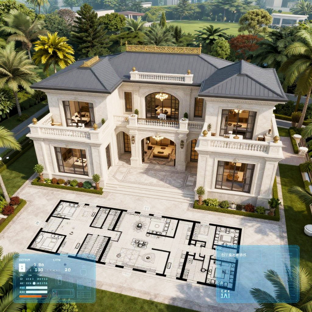 AI floorplan generator drafting a luxury villa blueprint, expansive rooms with elegant decor, lush garden surroundings visible, realistic shading and depth, modern architectural details combined with classical elements, digital HUD interface overlays in blue