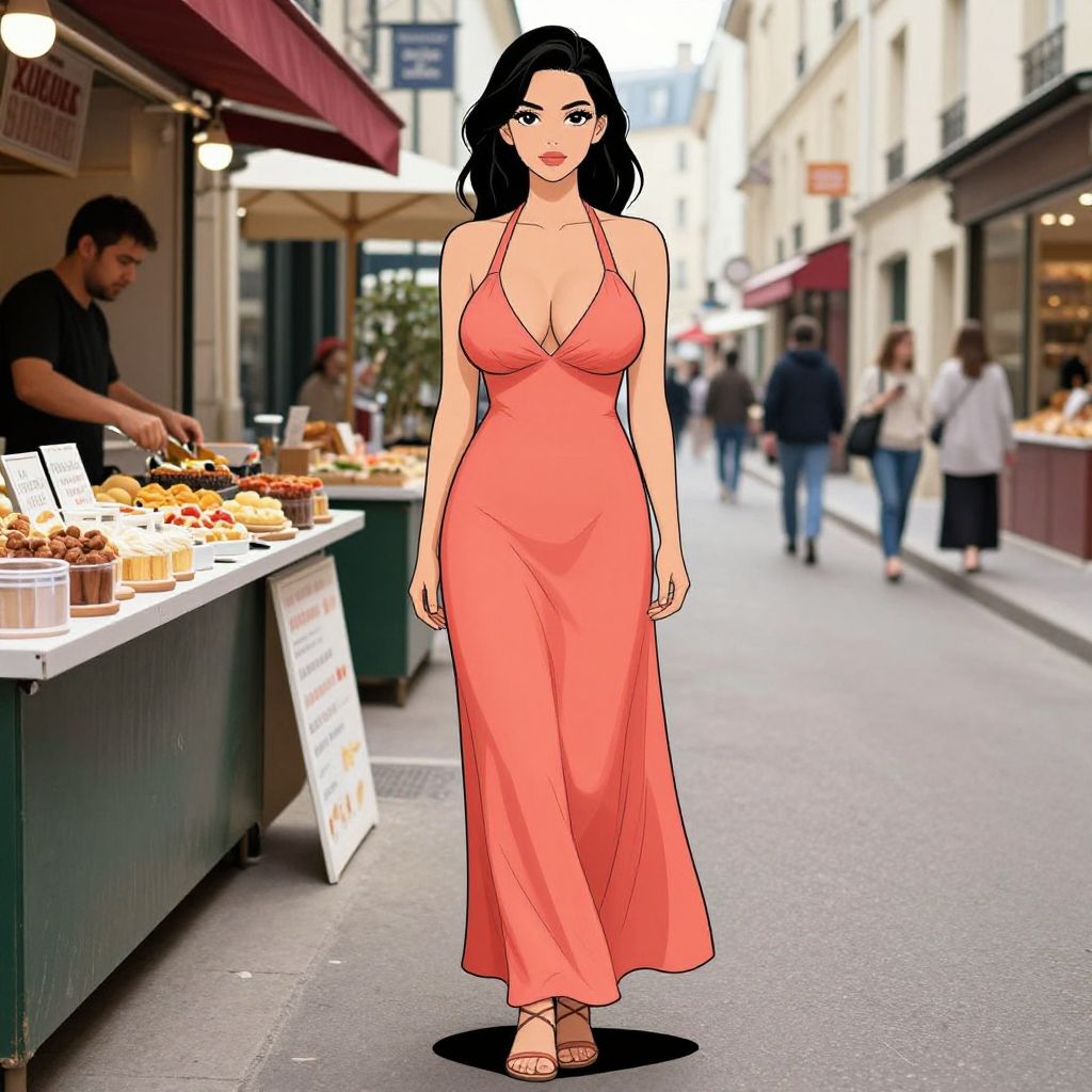A woman in a minimalist halter neck maxi dress in coral, paired with strappy flat sandals, standing in a gourmet street food scene in a Parisian alley, illustrated in the style of Kodansha comics. Sexy. Pretty face and beutiful eyes Sexy. Pretty face and beаutiful eyes. Big breasts