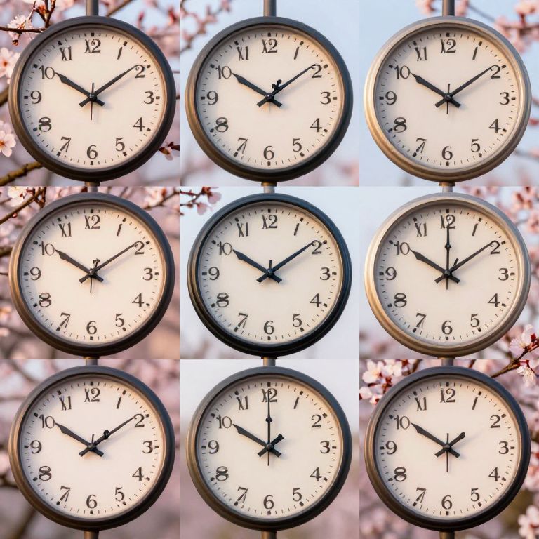 Clock faces bloom like flowers, each petal representing a different possible future, with travelers picking bloom-time at sunrise.